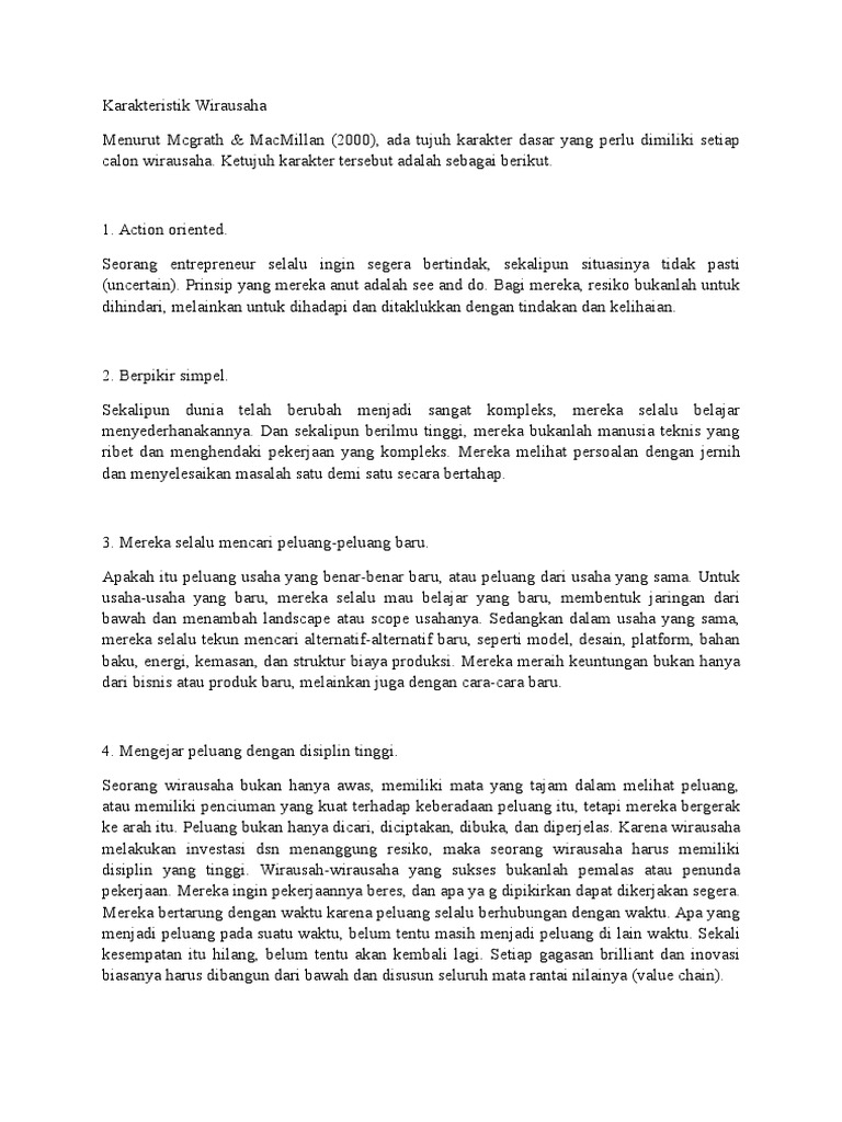 Karakteristik Wirausaha Menurut McGraith Mac Milan 2000 ada tujuh karakter dasar yang perlu dimiliki setiap calon wirausaha Entrepreneur. Seorang entrepreneur selalu ingin segera bertindak sekalipun situasinya tidak pasti uncertain. Karakteristik Wirausaha Menurut McGraith Mac Milan 2000 ada tujuh karakter dasar yang perlu dimiliki wirausaha.