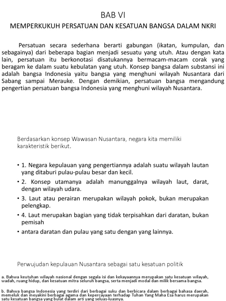 Berdasarkan konsep Wawasan Nusantara negara kita memiliki karakteristik berikut. Negara kepulauan yang merupakan suatu wilayah daratan yang luas. Makna Persatuan dan Kesatuan Bangsa.